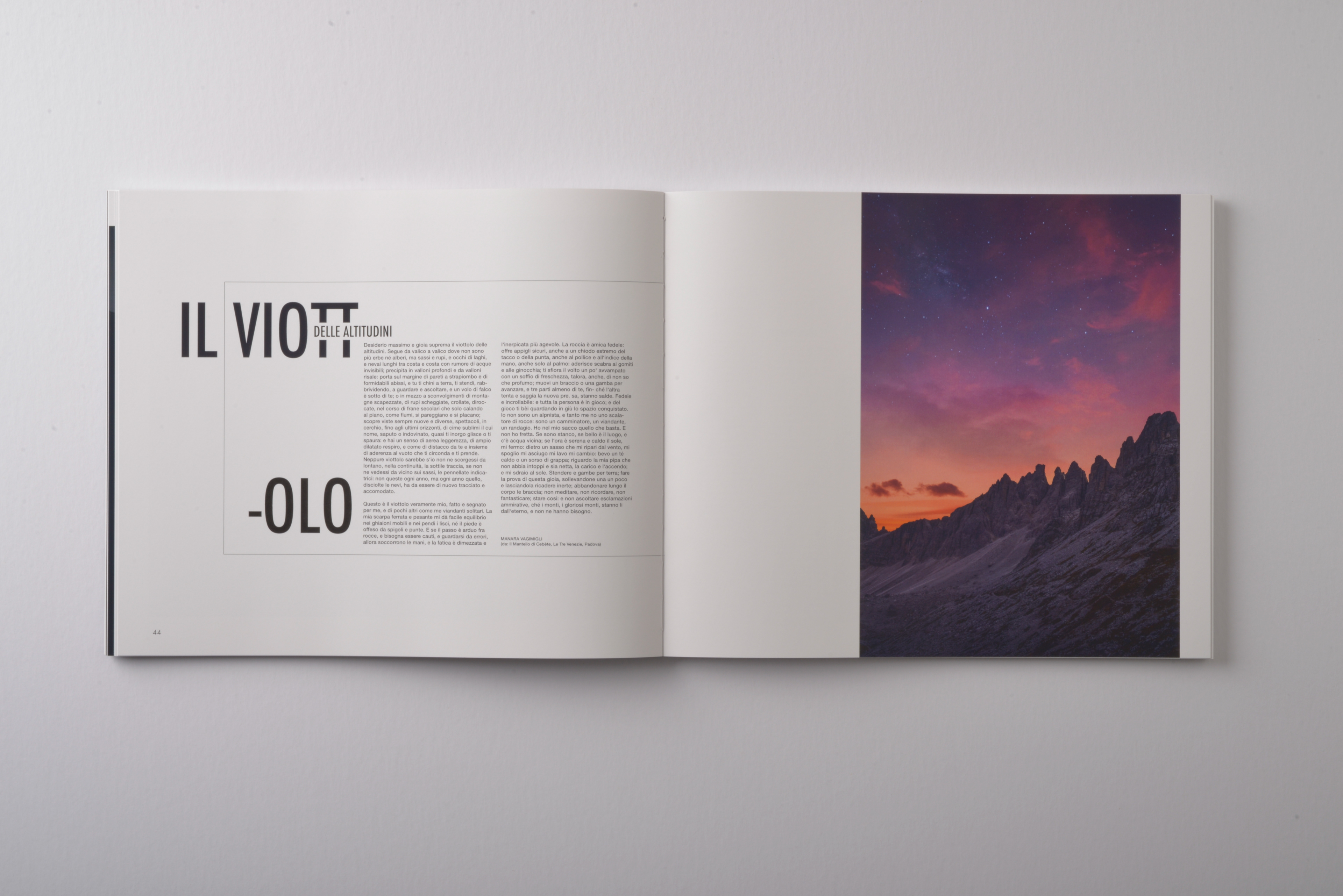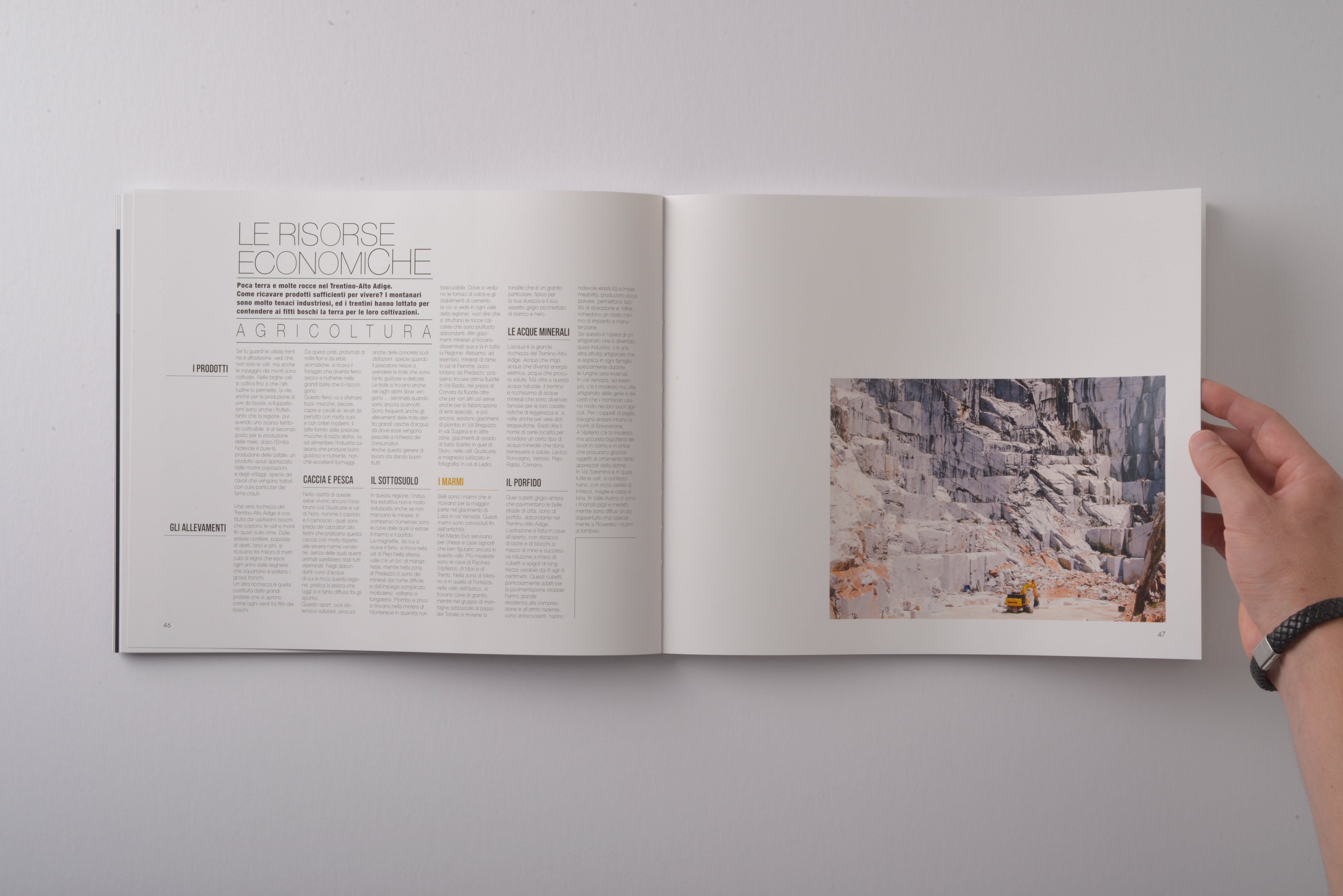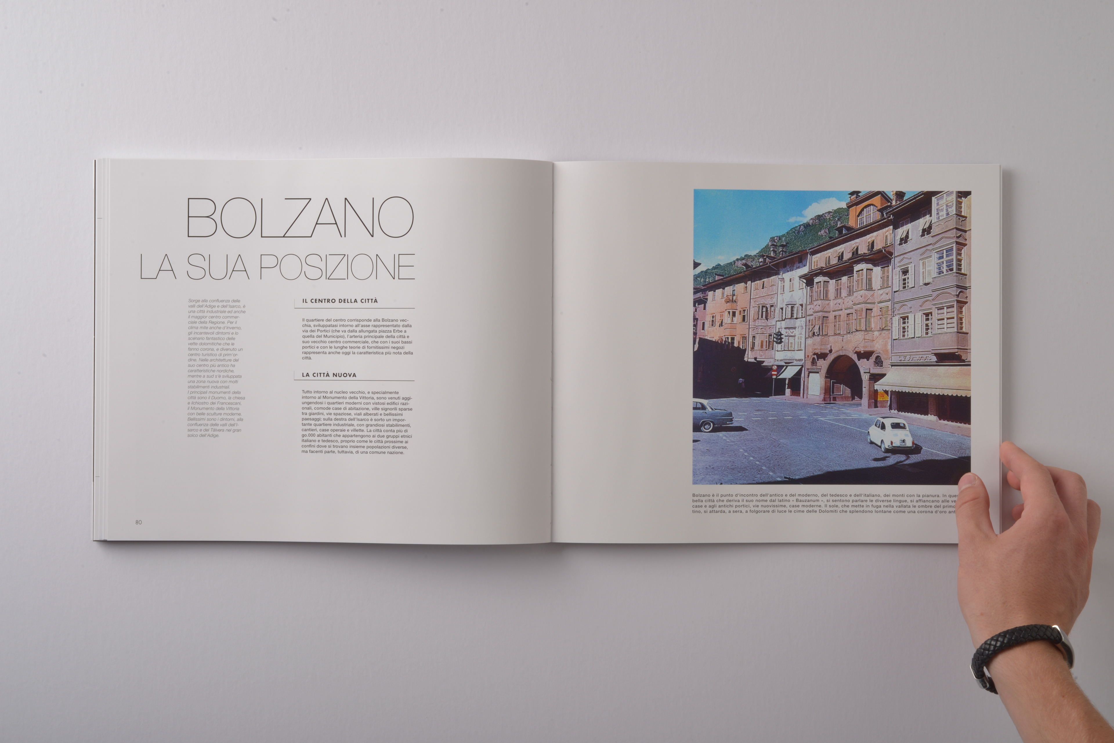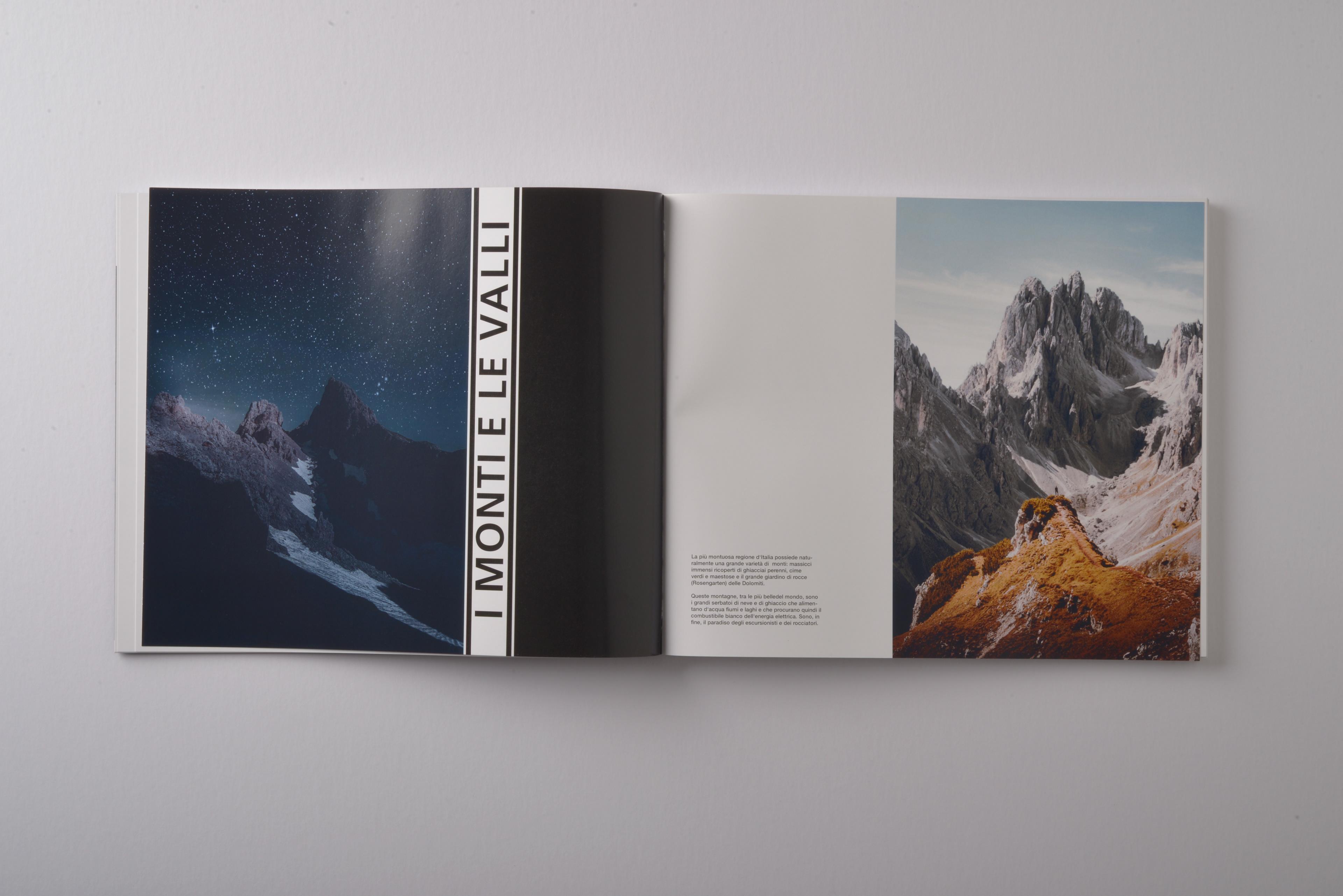 This project was a reinterpretation of the old information book Alla Scoperta del Trentino - Alto Adige. The assignment was to transform an existing book of our choice into a new version, with complete freedom in how to approach it. I decided on a minimalistic design with generous white space, reusing and reworking many of the original images while also integrating new photography. Some pages echo the layout of the old book as a subtle homage to its design. The final publication measures 270 × 320 mm and is hand-stitched with an open Swiss binding. As part of the accompanying exhibition Bücherwelt, I created a laser-cut map of Trentino - Alto Adige, conceived as a complementary artifact to the book.