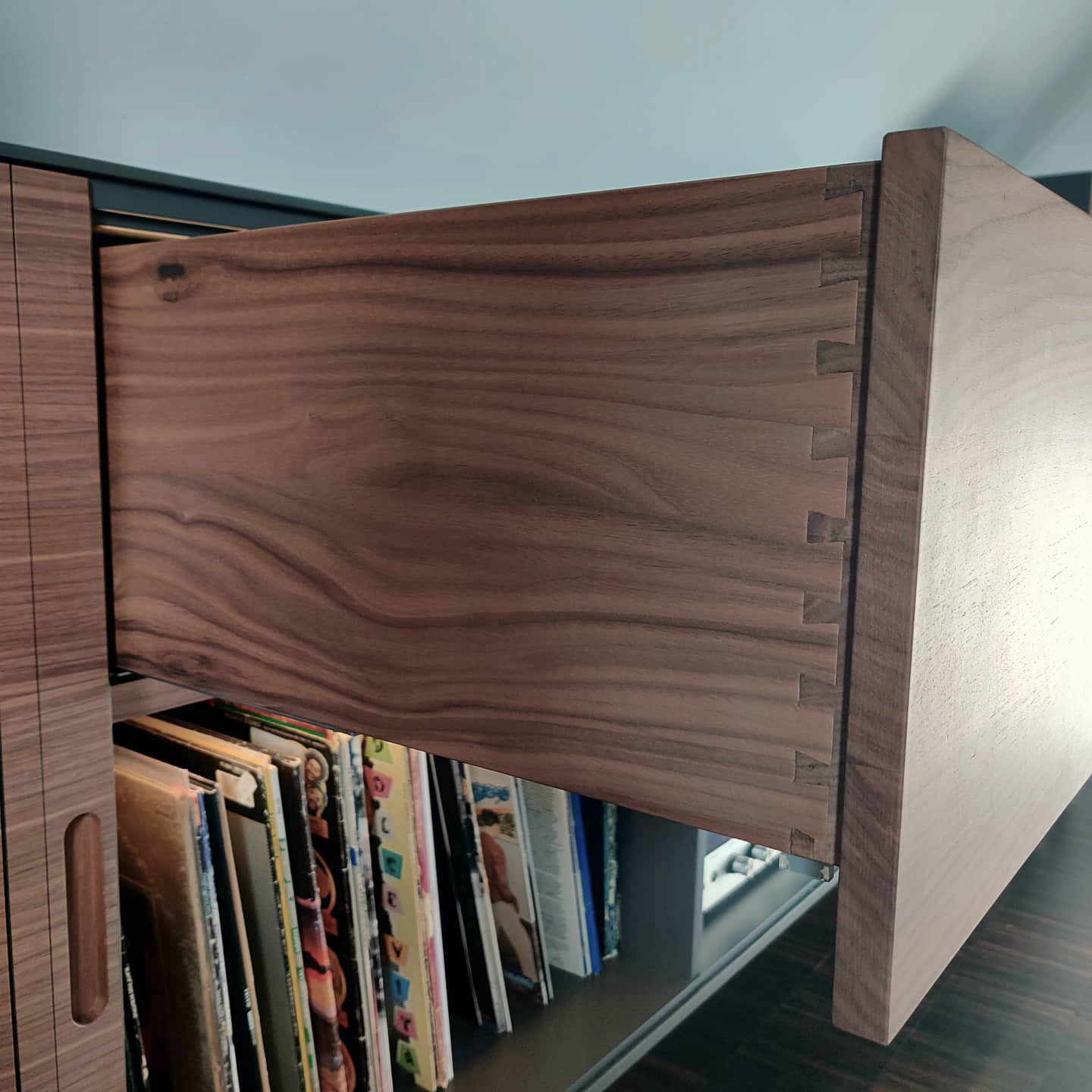 As part of my final project in carpentry school, I created a high-board that explores the interplay of form, material, and detail. Walnut surfaces contrast with grey-painted MDF, while two large tambour doors define the design with a distinctive rhythm and clarity. The speakers were developed as a matching extension of the piece, reinforcing its cohesive design language. Conceived as a storage solution for record players and media, the high-board goes beyond function, becoming a sculptural element within the living space. Subtle features such as the illuminated interior and finely integrated drawers add depth, atmosphere, and a refined sense of craftsmanship.